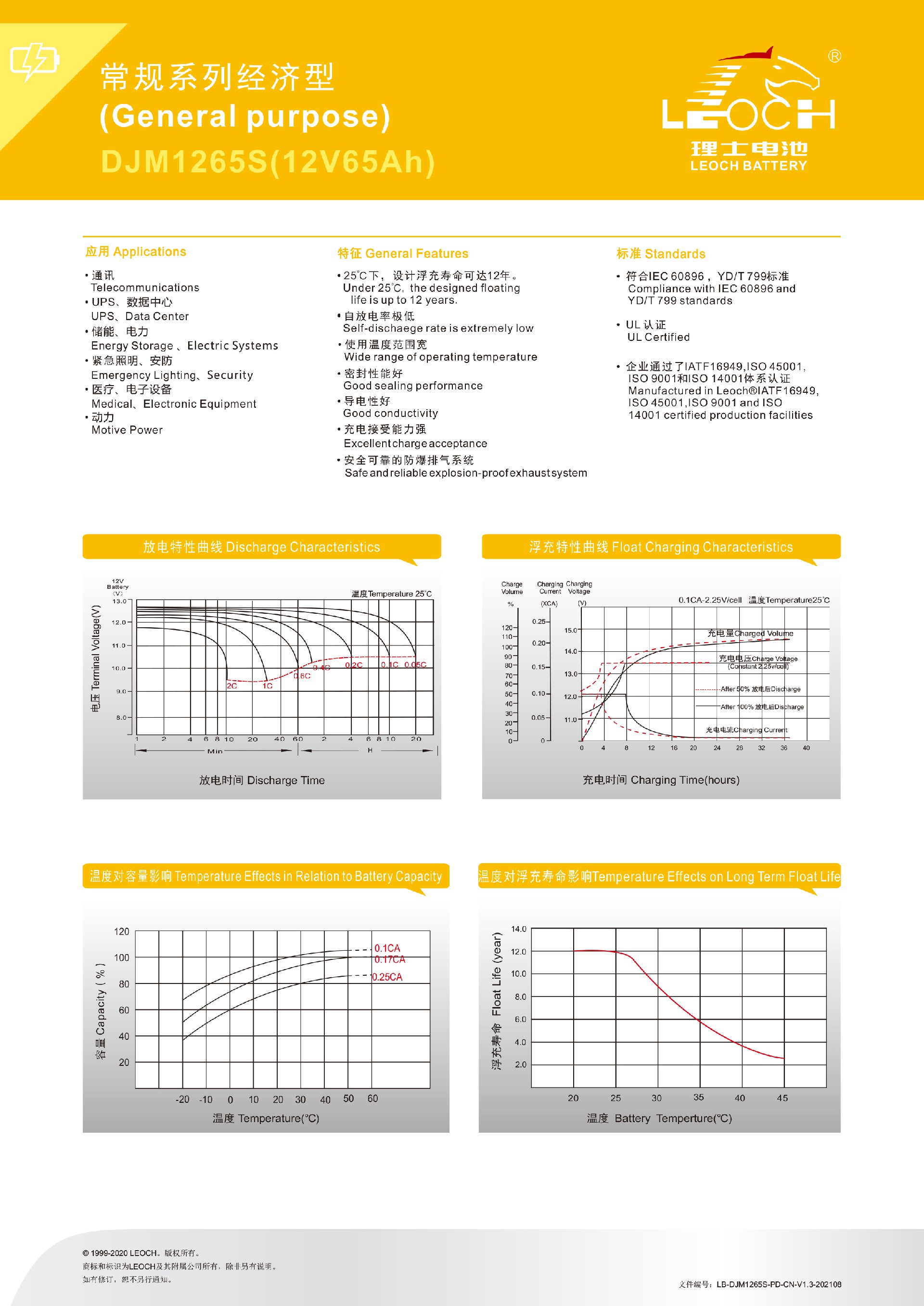 25℃下,设计浮充寿命可达12年。自放电率极低;使用范围宽;密封性能好,导电性好;充电接受能力强;安全可靠的防爆排气系统。符合IEC60896,YD/T799标准。UL认证