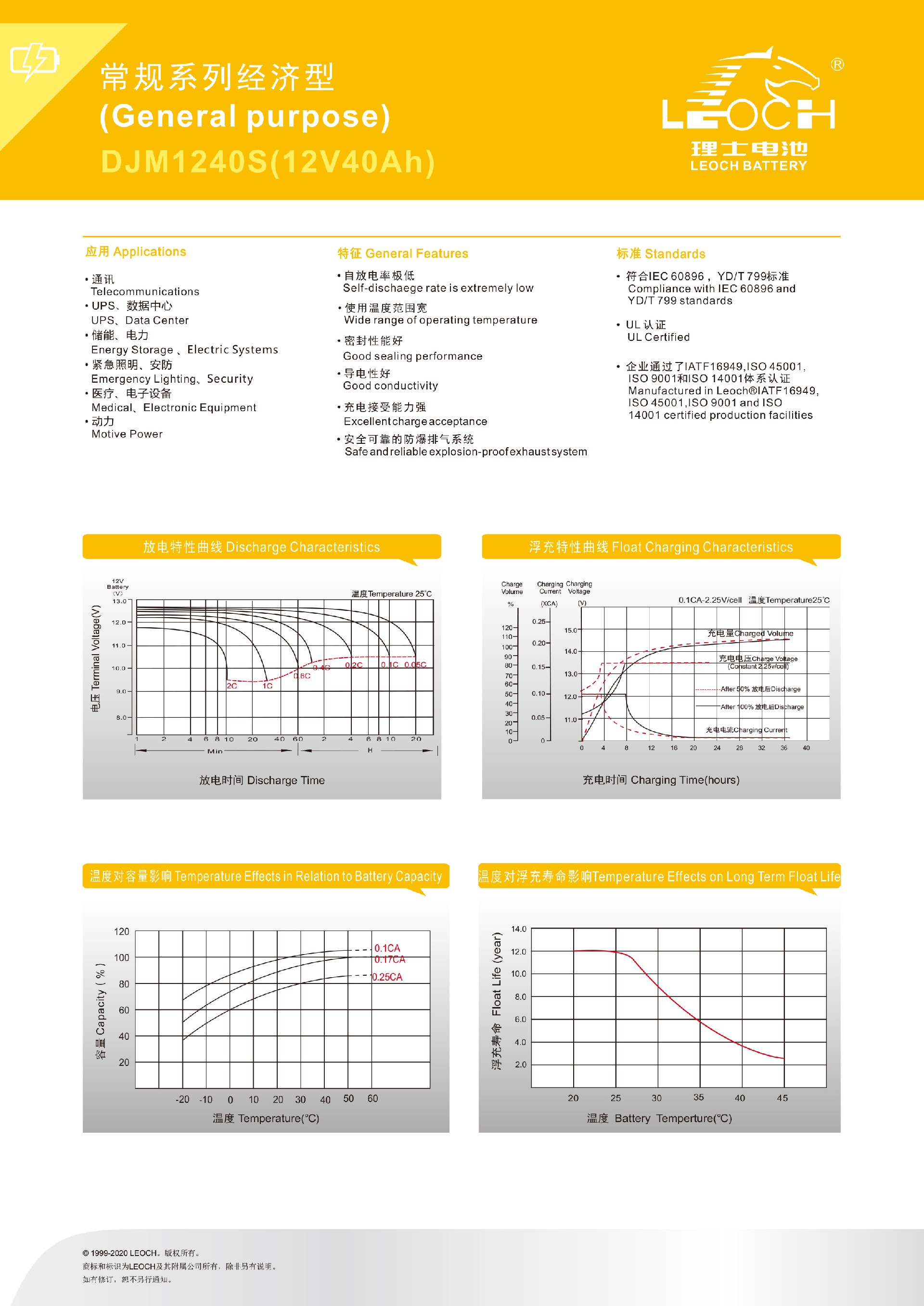 25℃下,设计浮充寿命可达12年。自放电率极低;使用范围宽;密封性能好,导电性好;充电接受能力强;安全可靠的防爆排气系统。符合IEC60896,YD/T799标准。UL认证
