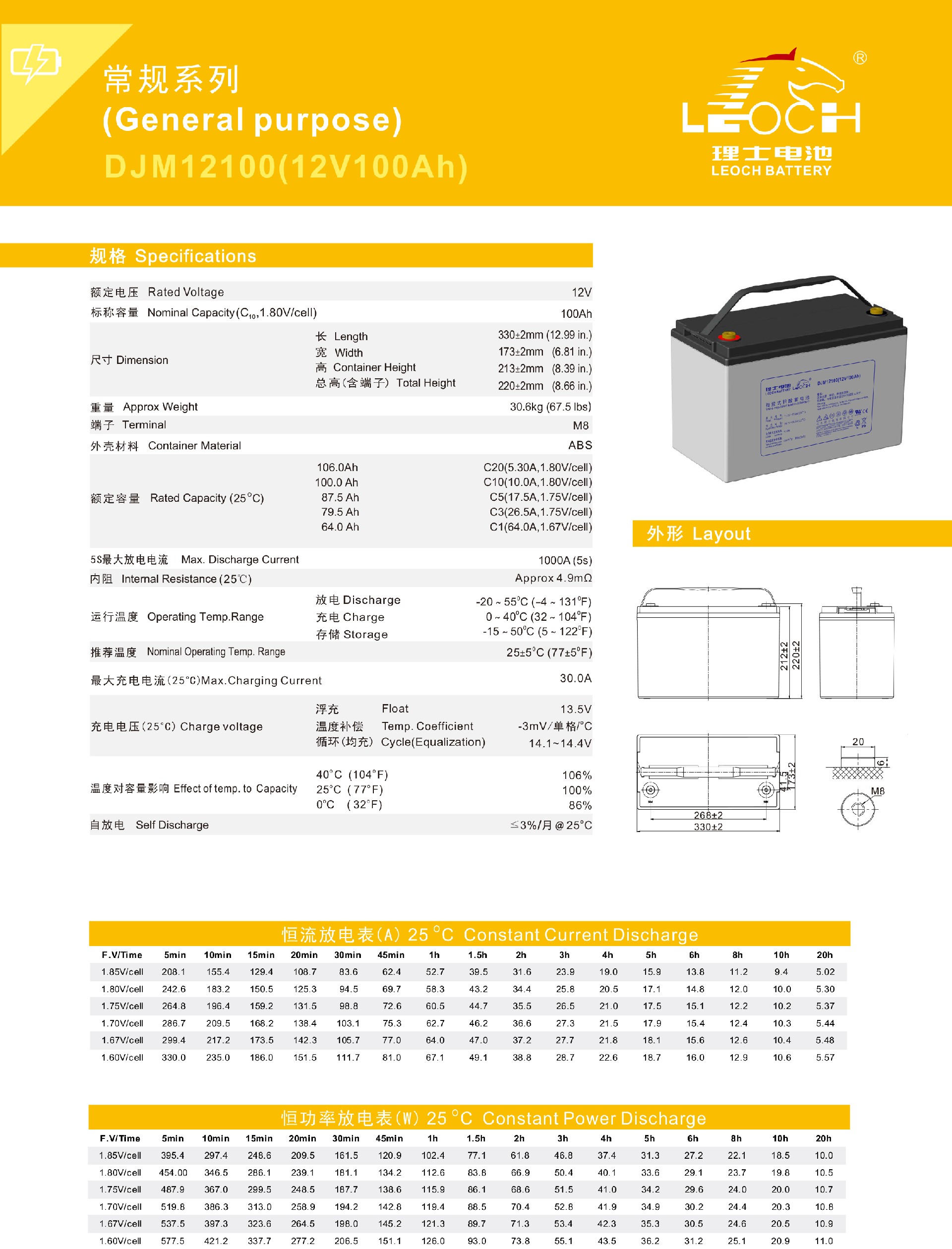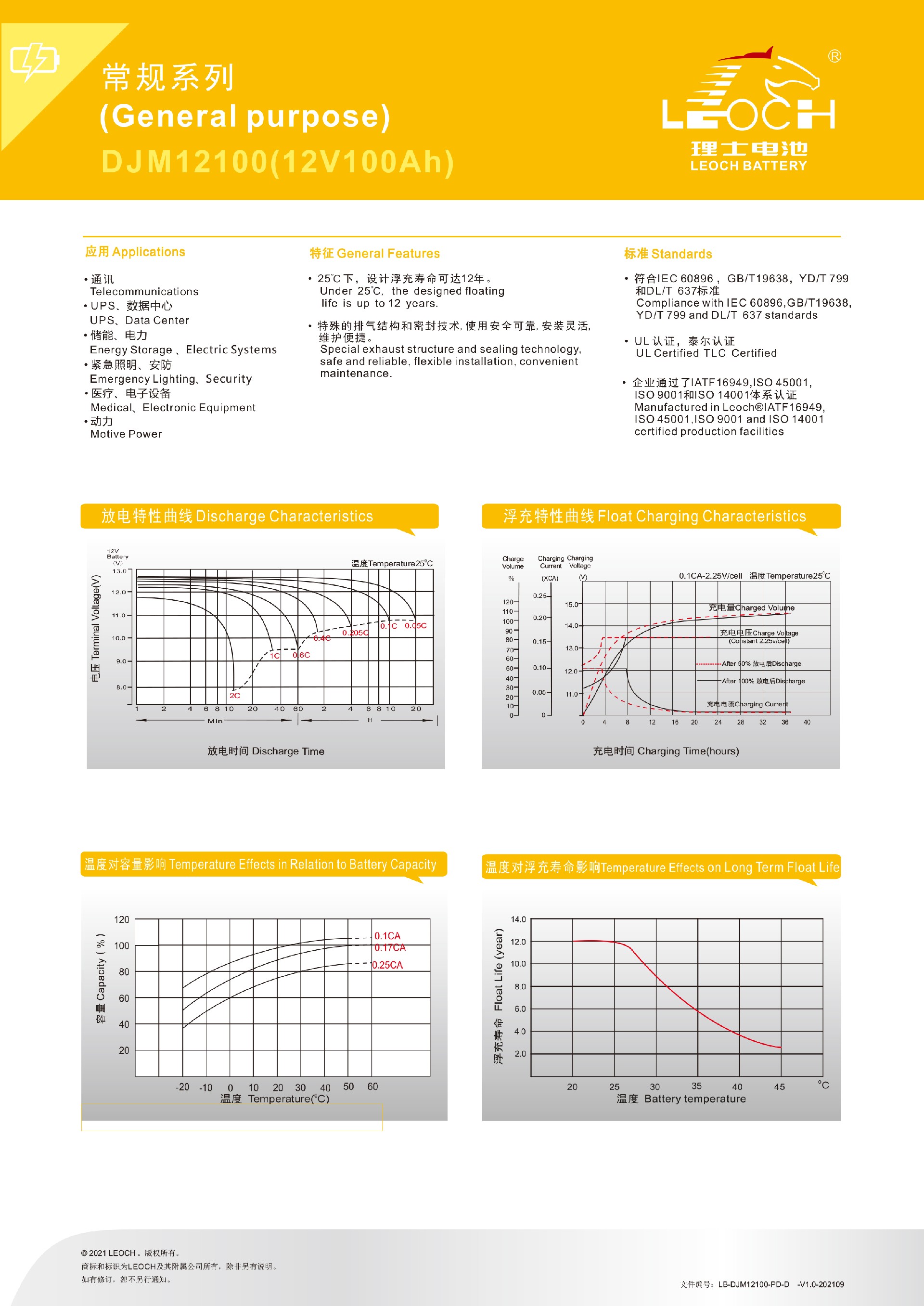 25℃下,设计浮充寿命可达12年。特殊的排气结构和密封技术,使用安全可靠,安装灵活,维护便捷。符合IEC60896,GB/T19638,YD/T799和DL/T637标准。UL认证,泰尔认证,CE认证