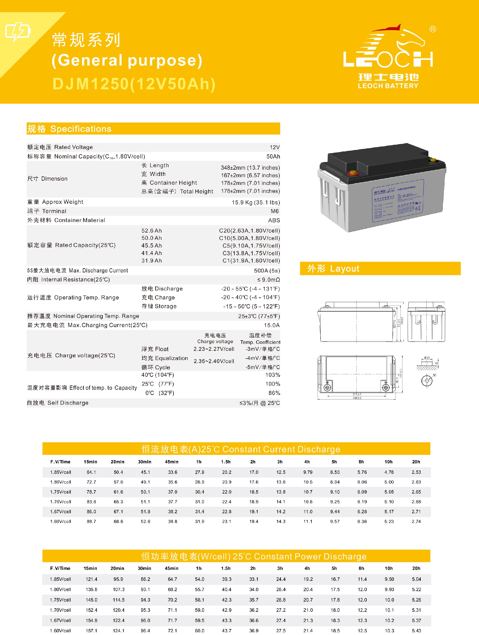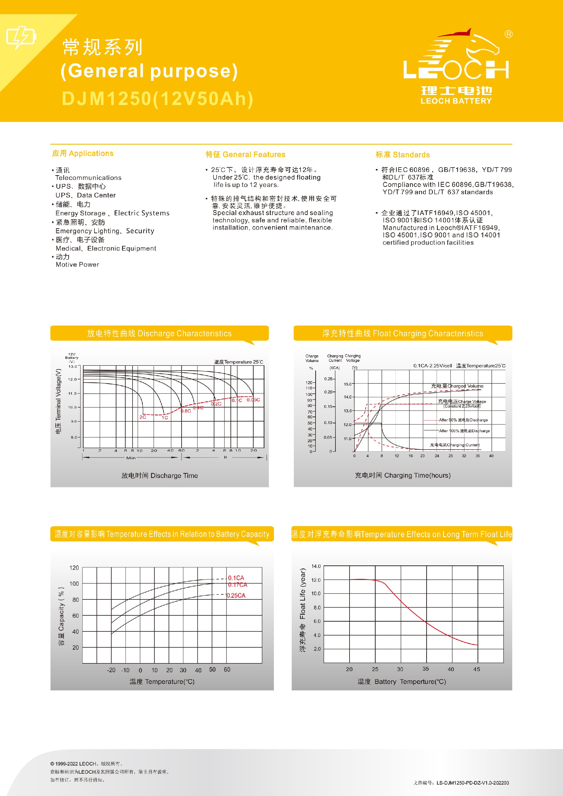 25℃下,设计浮充寿命可达12年。特殊的排气结构和密封技术,使用安全可靠,安装灵活,维护便捷。符合IEC60896,GB/T19638,YD/T799和DL/T637标准。UL认证,泰尔认证,CE认证